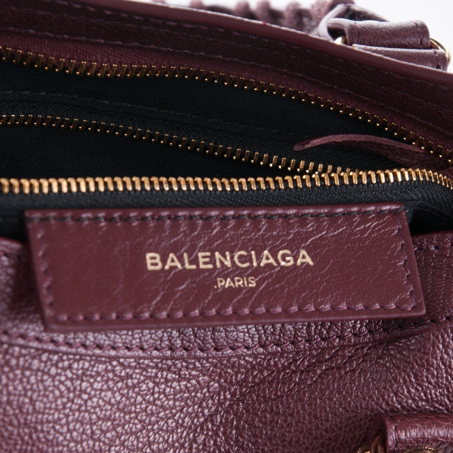 This chic tote is crafted from goatskin leather in a rich prune violet color. The bag features whipstitched rolled leather top handles and a detachable shoulder strap. The face of the bag is embellished with a zipper pocket and gold-tone hardware. The top zipper opens to a spacious leather interior with a zipper and slips pockets. This is an excellent handbag, ideal for everyday use, with the distinctive style of Balenciaga!
