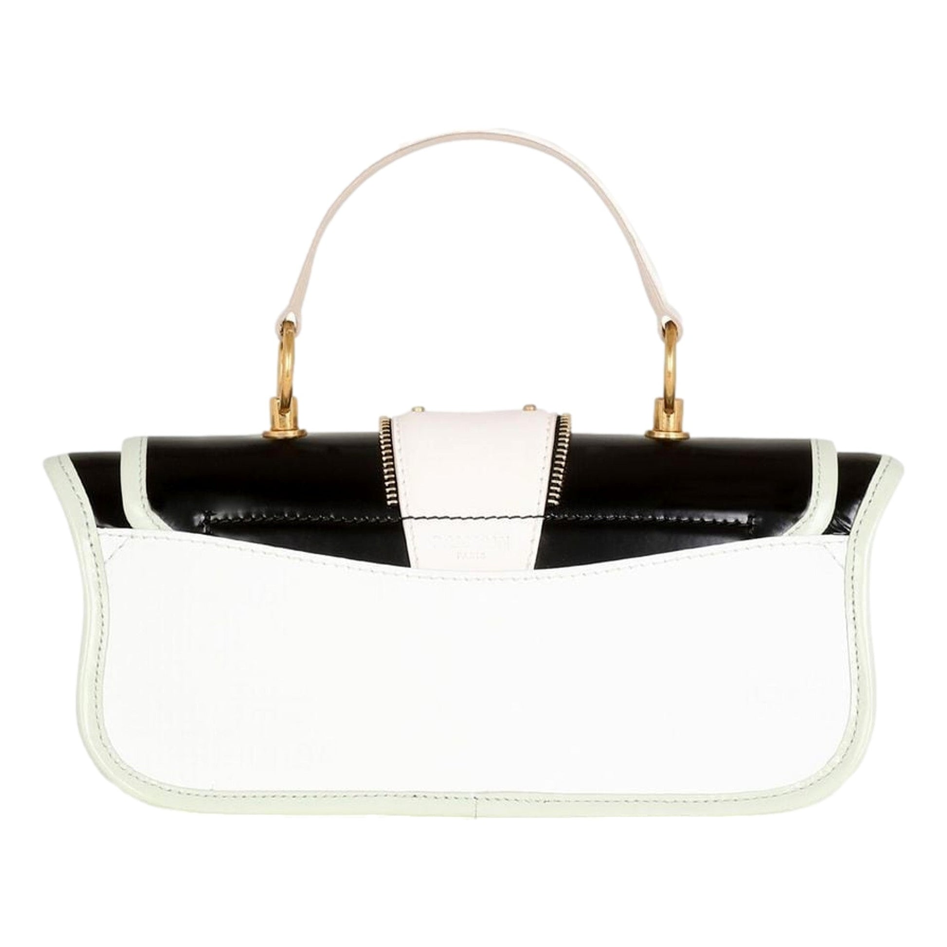 Introducing the Balmain Blaze Mint Green Leather Baguette Top Handle Crossbody Bag, exuding timeless elegance in a sophisticated multi color hue. This bag features an additional black leather strap that allows for effortless transition from crossbody to shoulder carry. The front flap, adorned with a magnetic closure for secure fastening, showcasing the iconic Balmain emblem. Inside, discover a thoughtfully designed interior with one internal patch pocket, providing convenient storage for essentials. Finished with gold metal hardware. Elevate your ensemble with the Balmain Blaze Mint Green Leather Baguette.