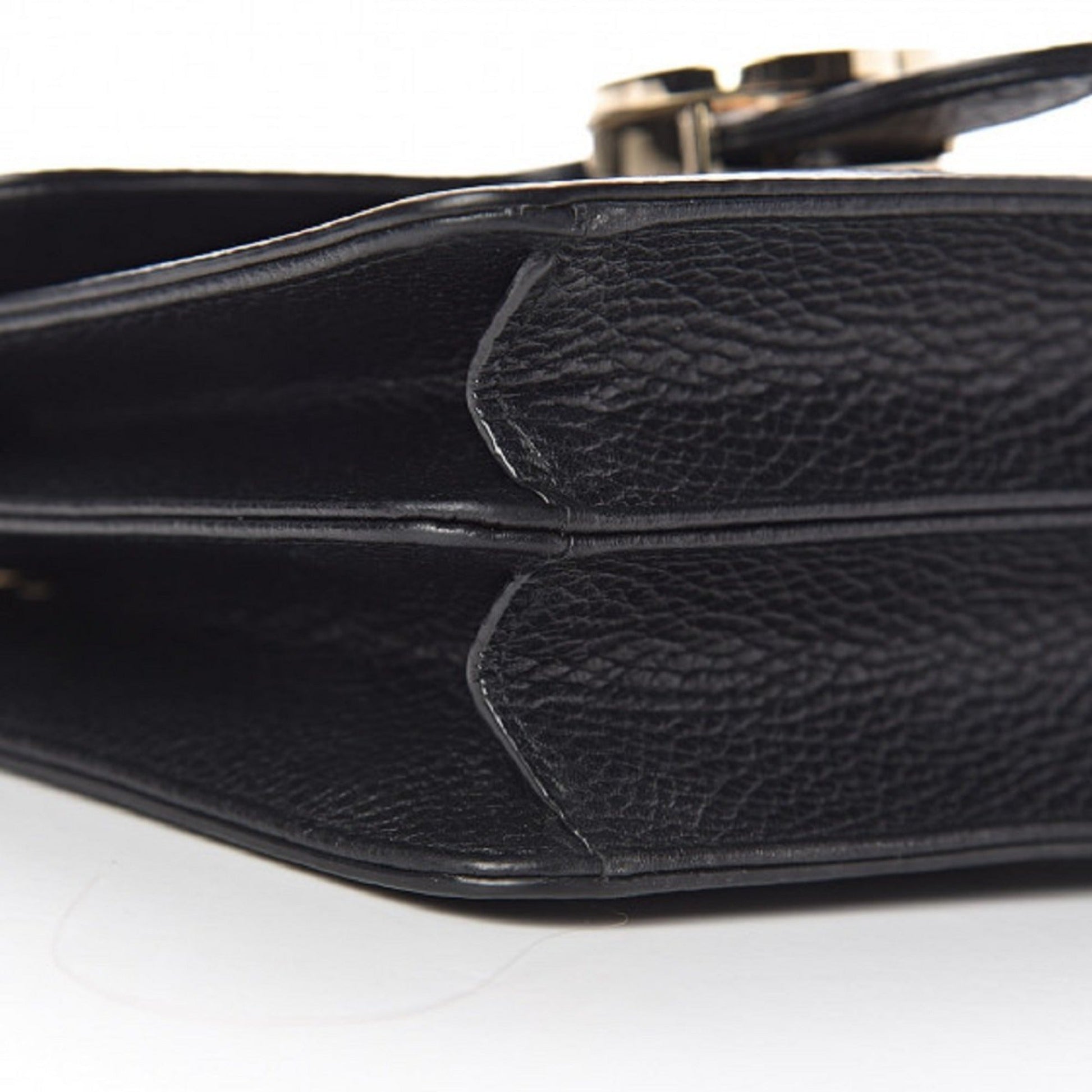 This Gucci crossbody bag is conveniently sized traveling handbag is designed with soft black pebbled leather. With its gold chain shoulder strap, the purse gives an air of sophistication and elegance. The interlocking GG clasp keeps it safe, and with two open interior sections and one open card slot. This handbag is as useful as it is beautiful.