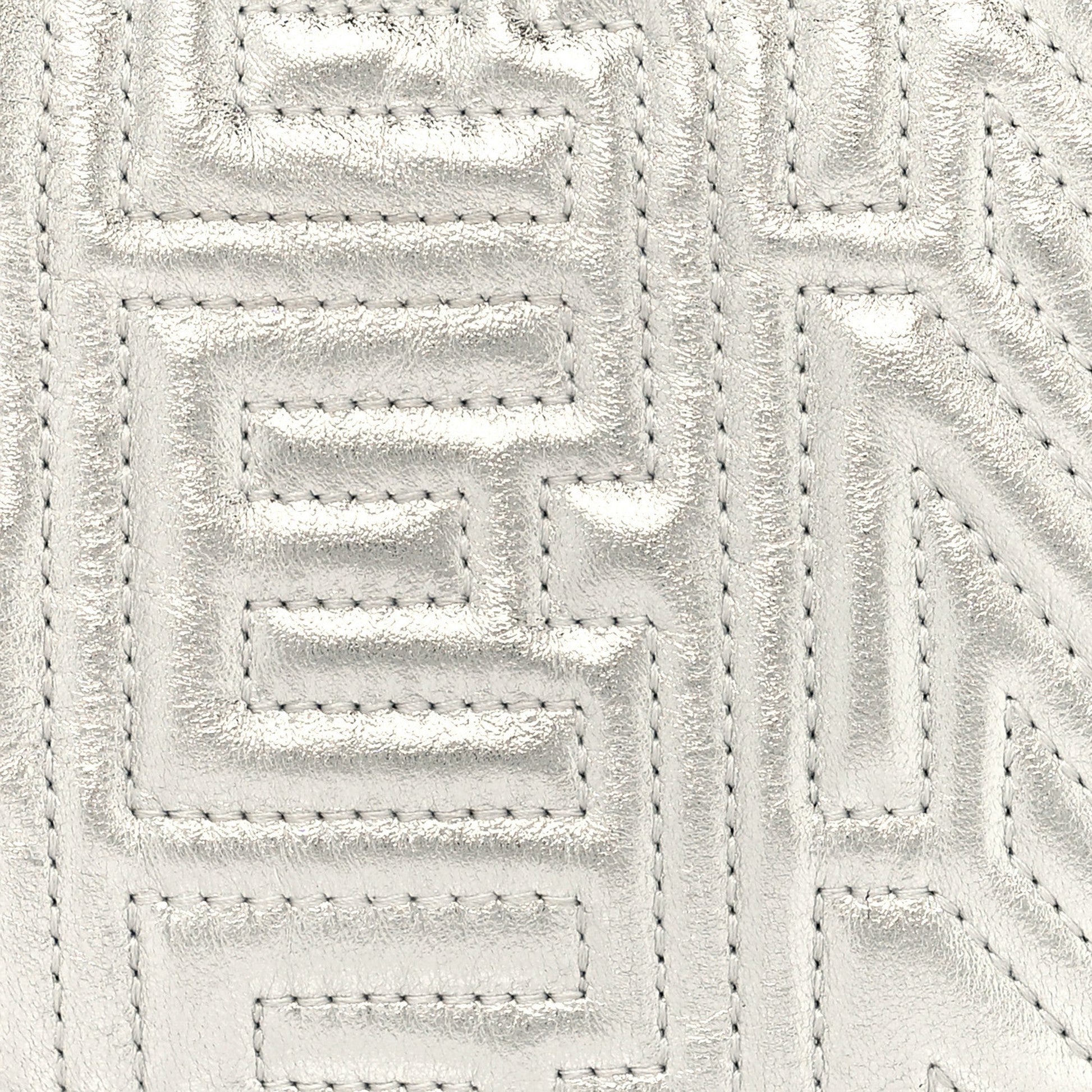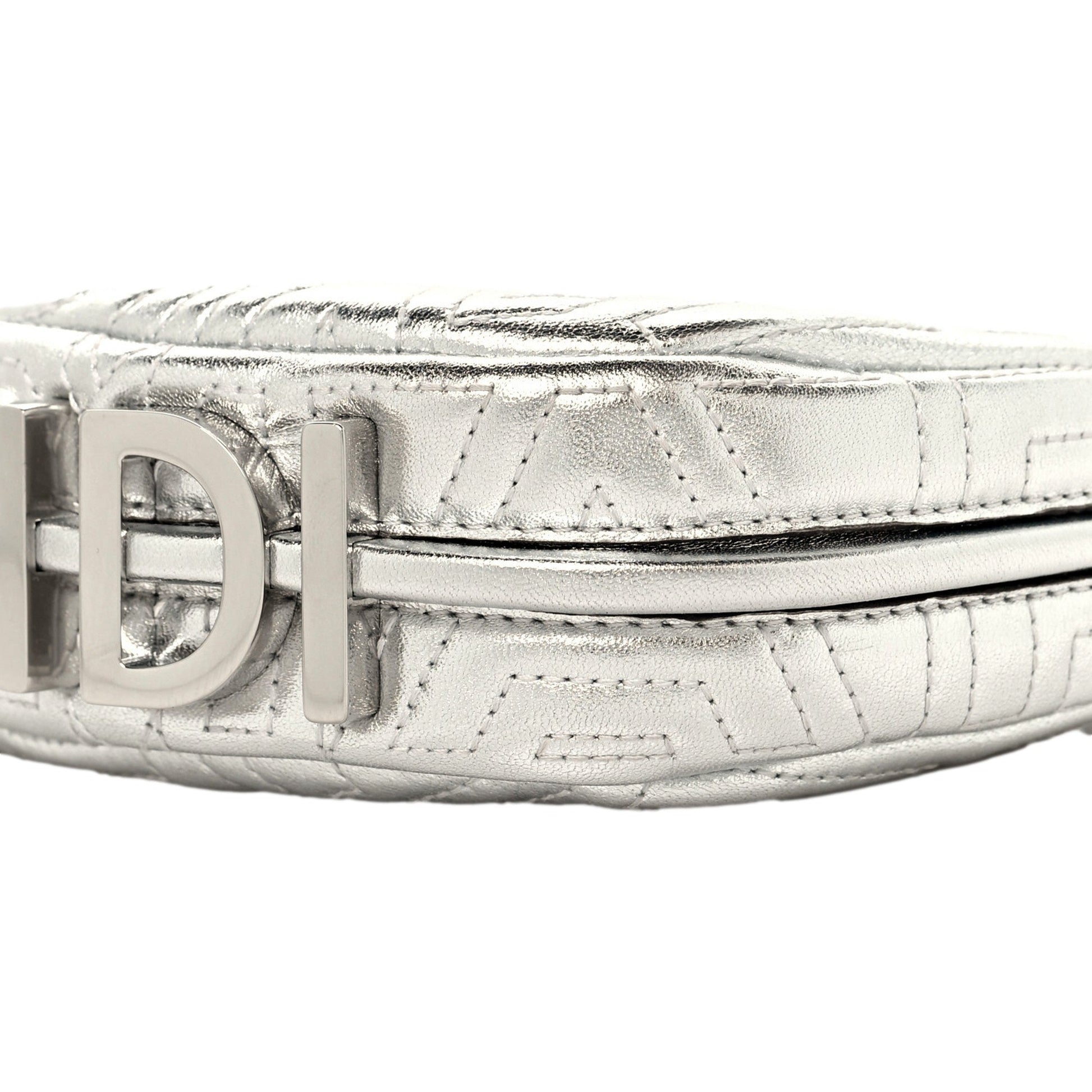 Presenting the Fendi x Marc Jacobs Fendigraphy Silver Nano Embroidered Miniature Hobo Charm Leather Bag. This exquisite piece features a striking silver leather exterior and a luxurious white leather interior with one interior pocket. Adorned with sleek silver hardware, this miniature hobo charm bag is a perfect blend of sophistication and charm. Ideal for carrying essentials with elegance, it embodies the collaboration between Fendi and Marc Jacobs, making it a coveted accessory for every fashion enthusiast