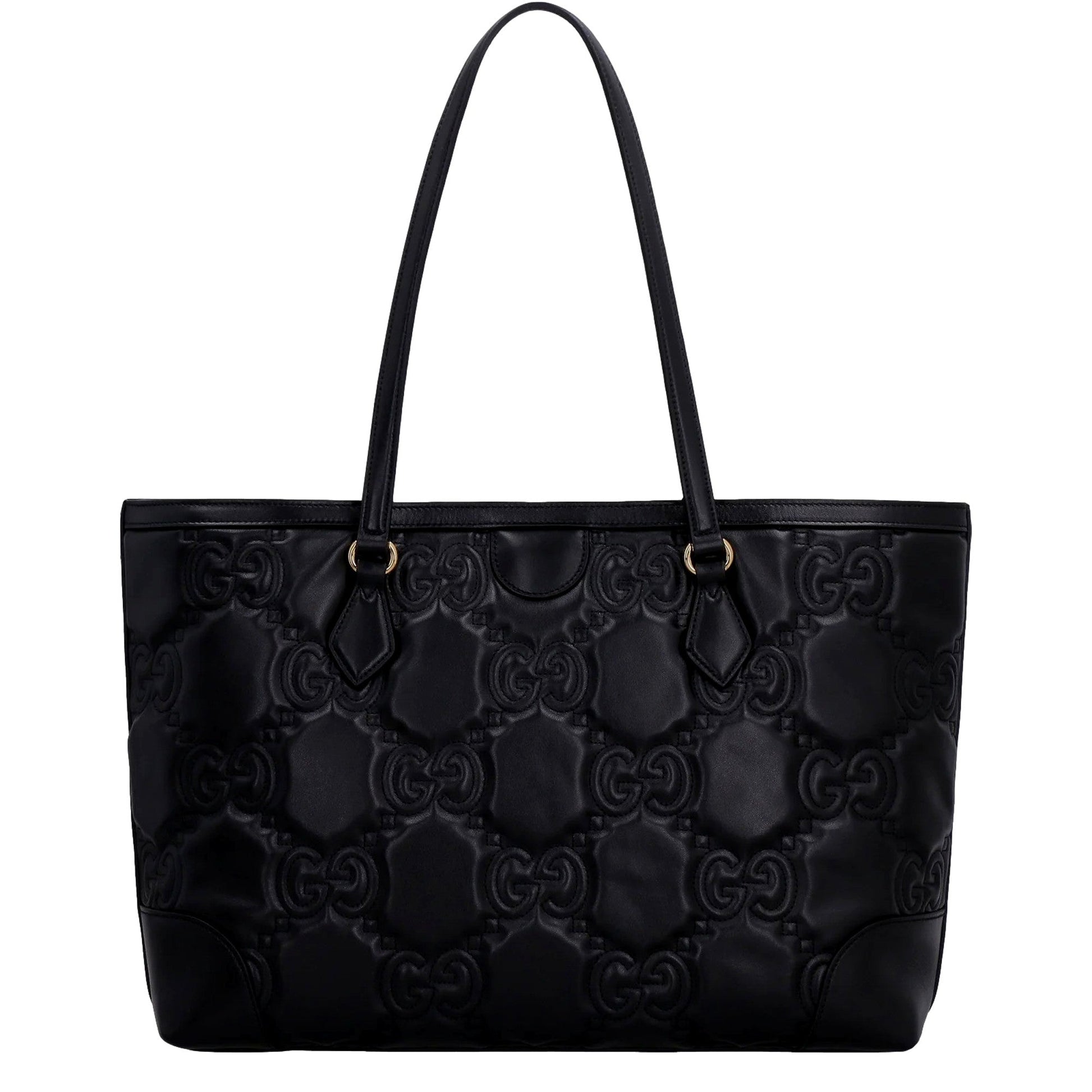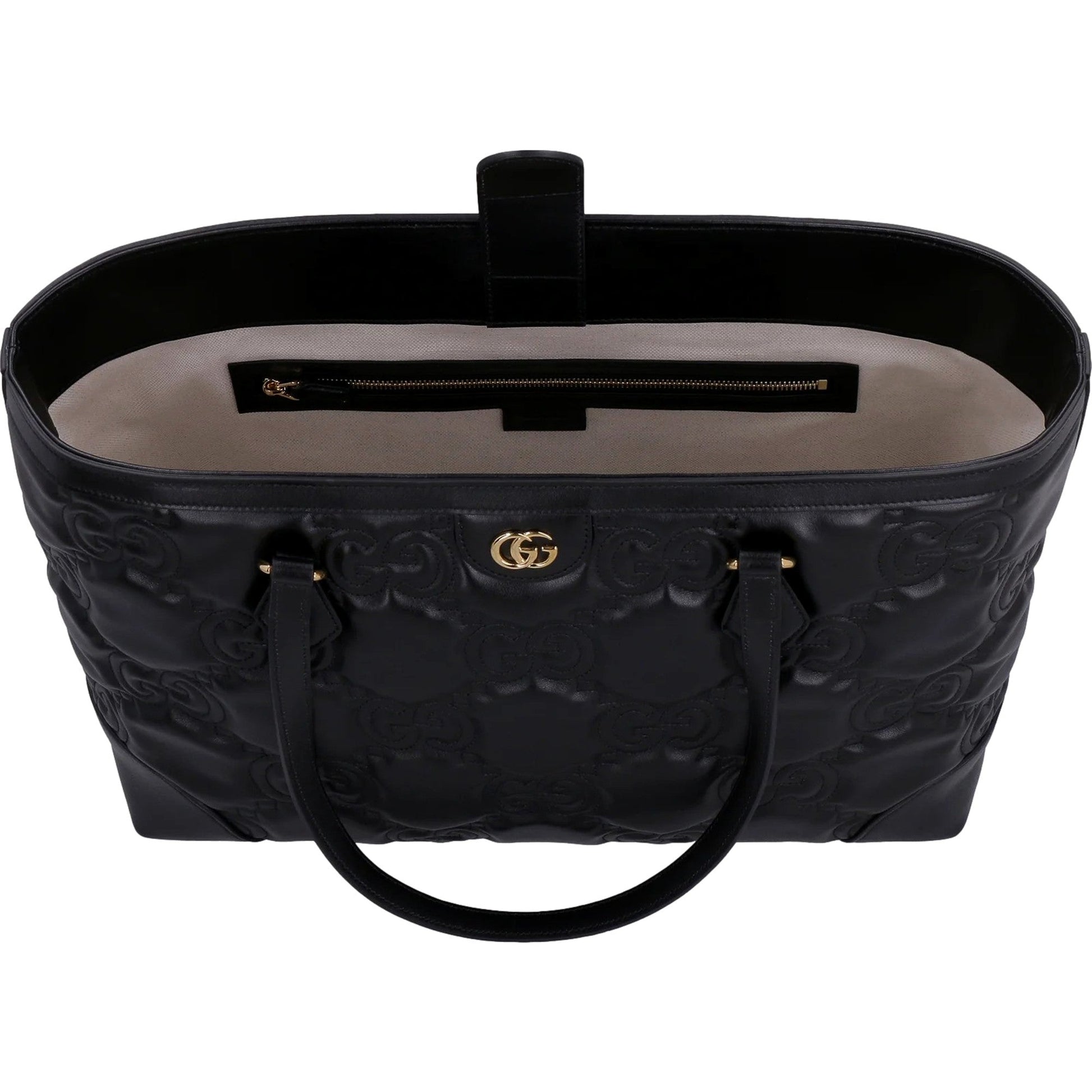 The interior is lined with a contrasting fabric, featuring several pockets for easy organization of smaller items. The bag is finished with the signature Gucci gold-tone hardware, including the iconic GG logo on the front, further elevating its sophisticated aesthetic. Whether for daily use or as an elegant accent to a more formal look, the Gucci GG Matelassé Medium Tote is a chic, functional accessory that complements both casual and dressy outfits.