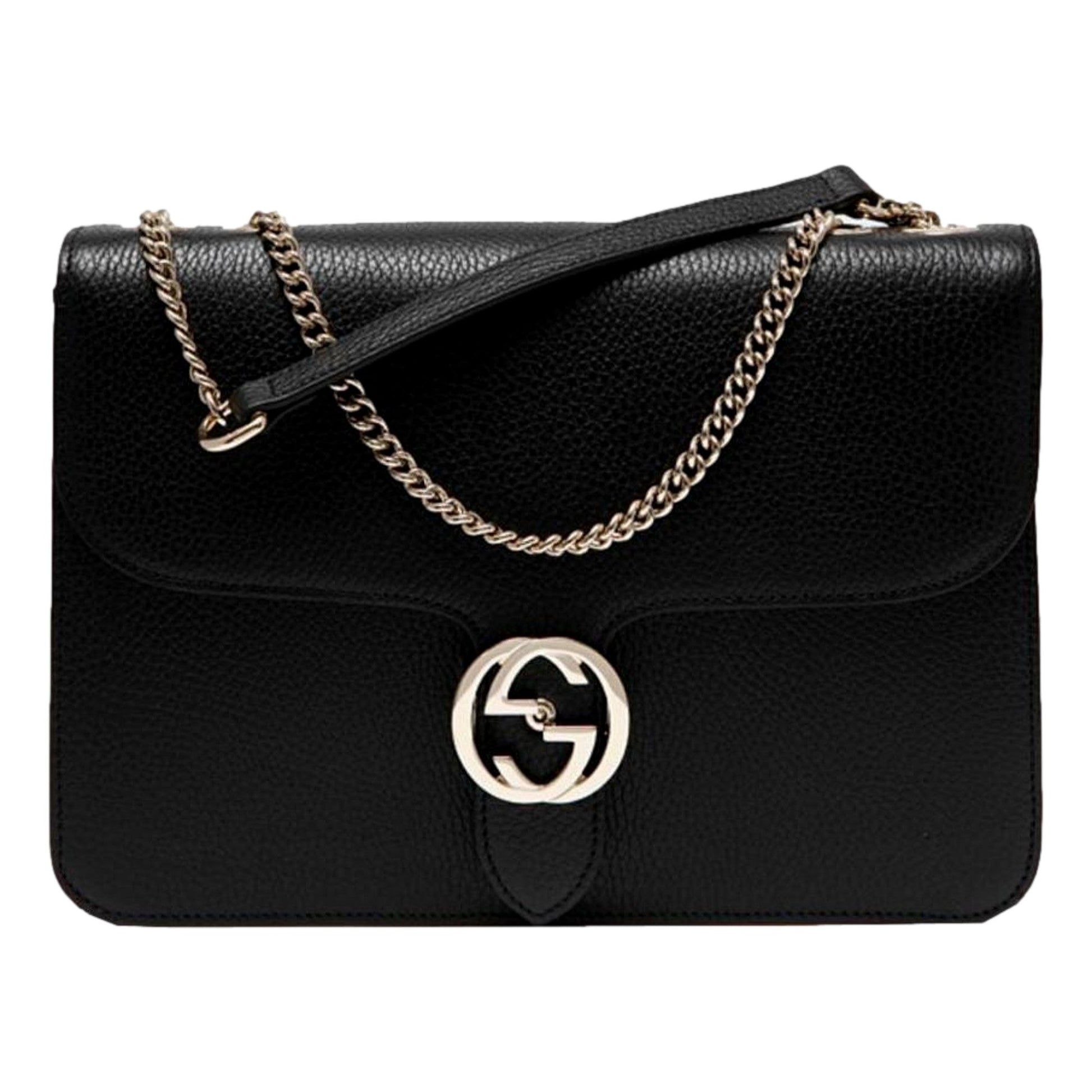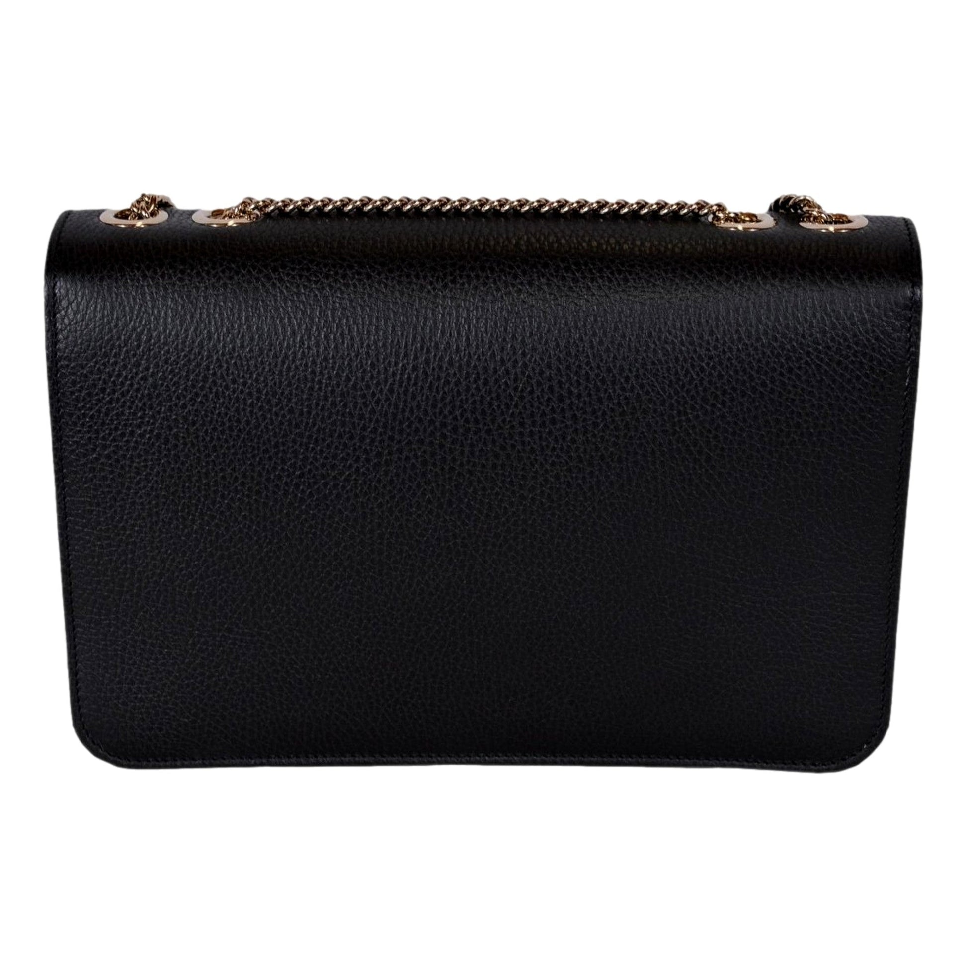 Crafted for the designer lover, this impeccably sized handbag is a statement of timeless elegance and refined functionality. Made from supple jet black pebbled leather, it exudes both durability and understated luxury. The signature Gucci gold-tone chain shoulder strap adds a touch of opulence, seamlessly blending classic sophistication with modern allure.