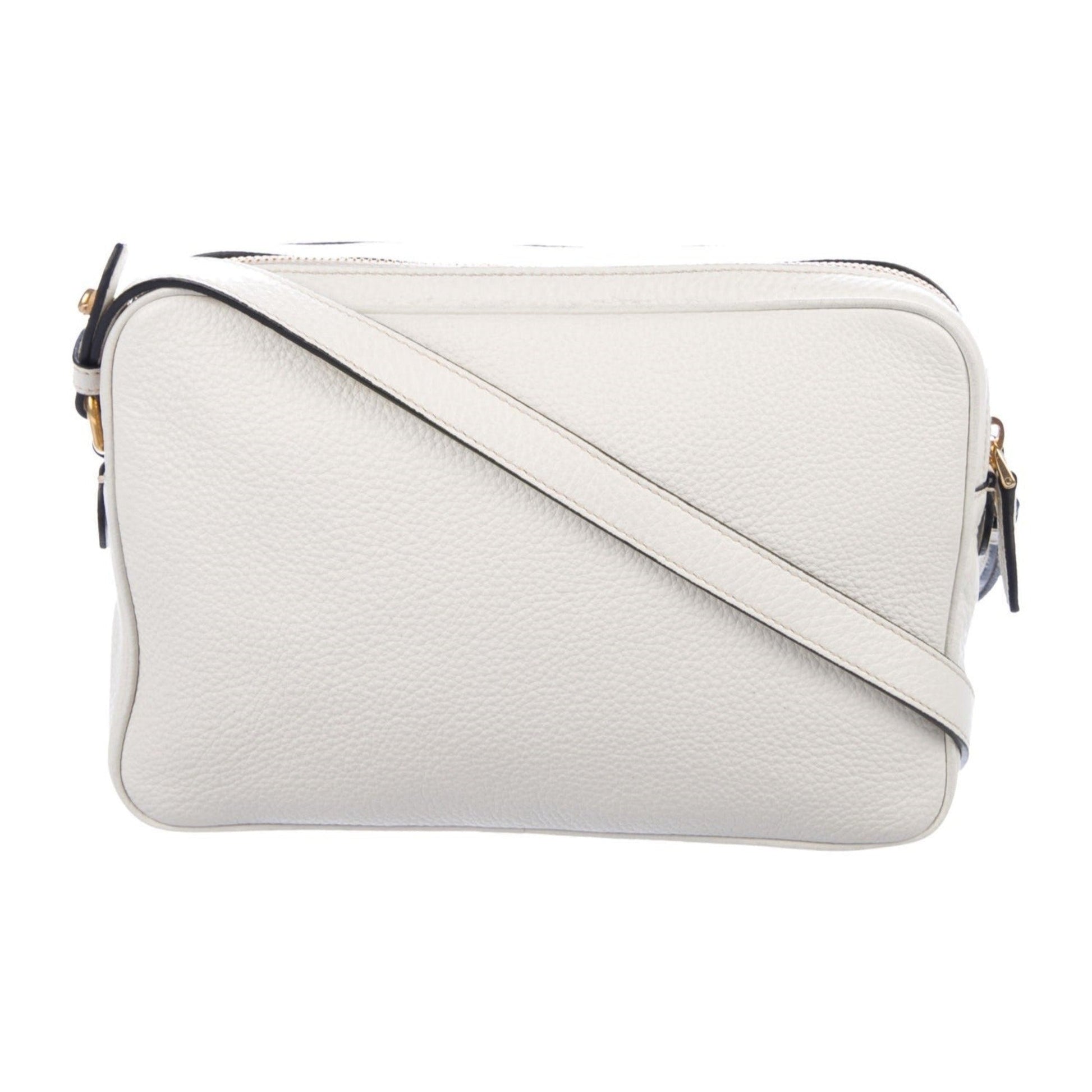 This Prada Women's White Vitello Phenix Leather Crossbody Handbag is a beautiful and elegant handbag that can be worn with everyday looks. It is practical yet luxurious and comes with an adjustable shoulder strap. The two zipper compartments are great for storage and organizing your personal belongings. The gold toned hardware and Prada Paris logo goes beautifully with this white Prada handbag. Includes authenticity cards and Prada dust-bag.