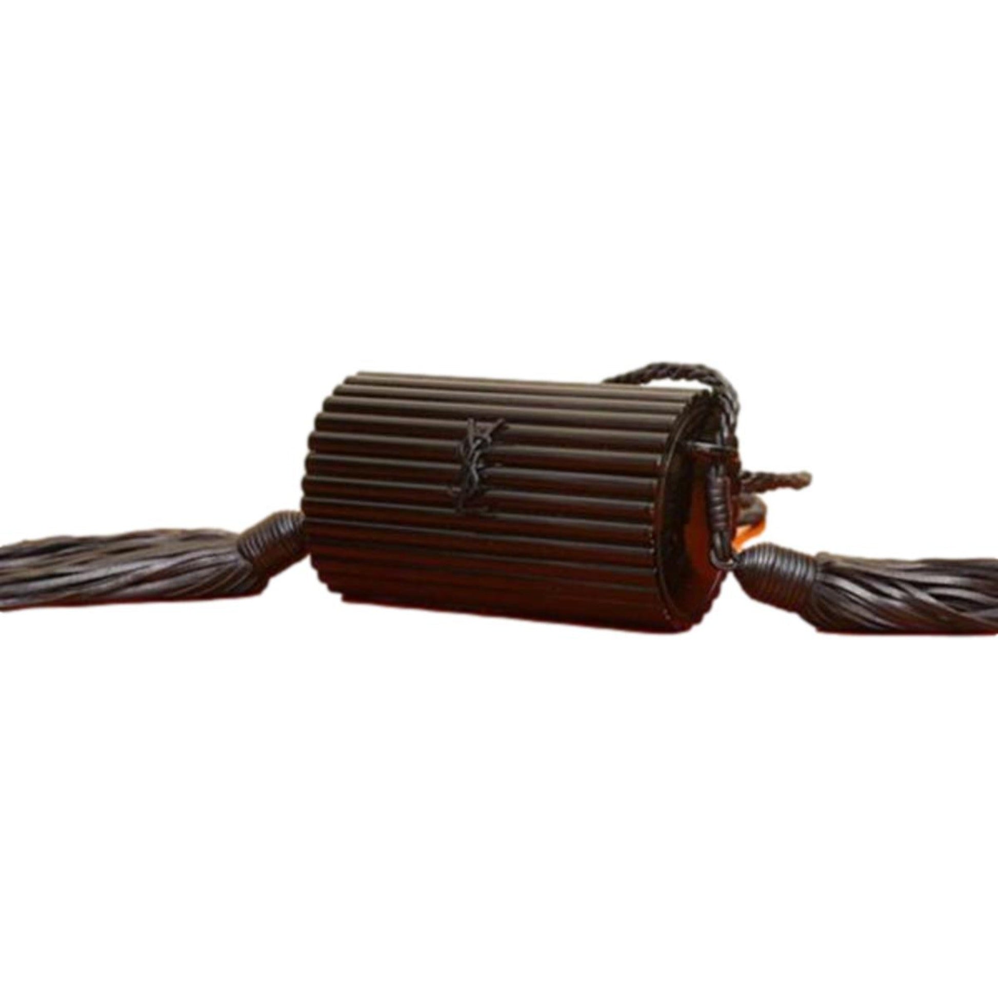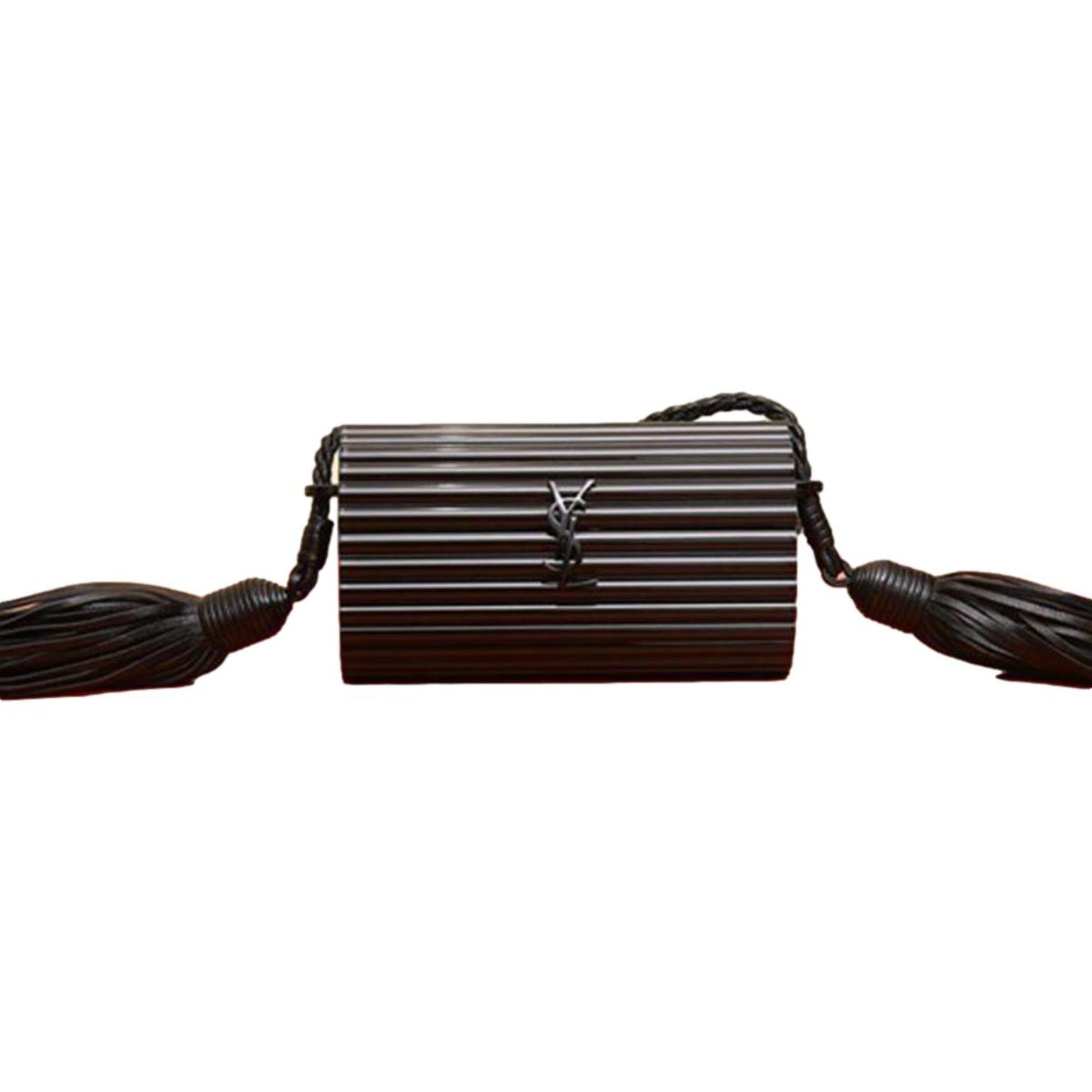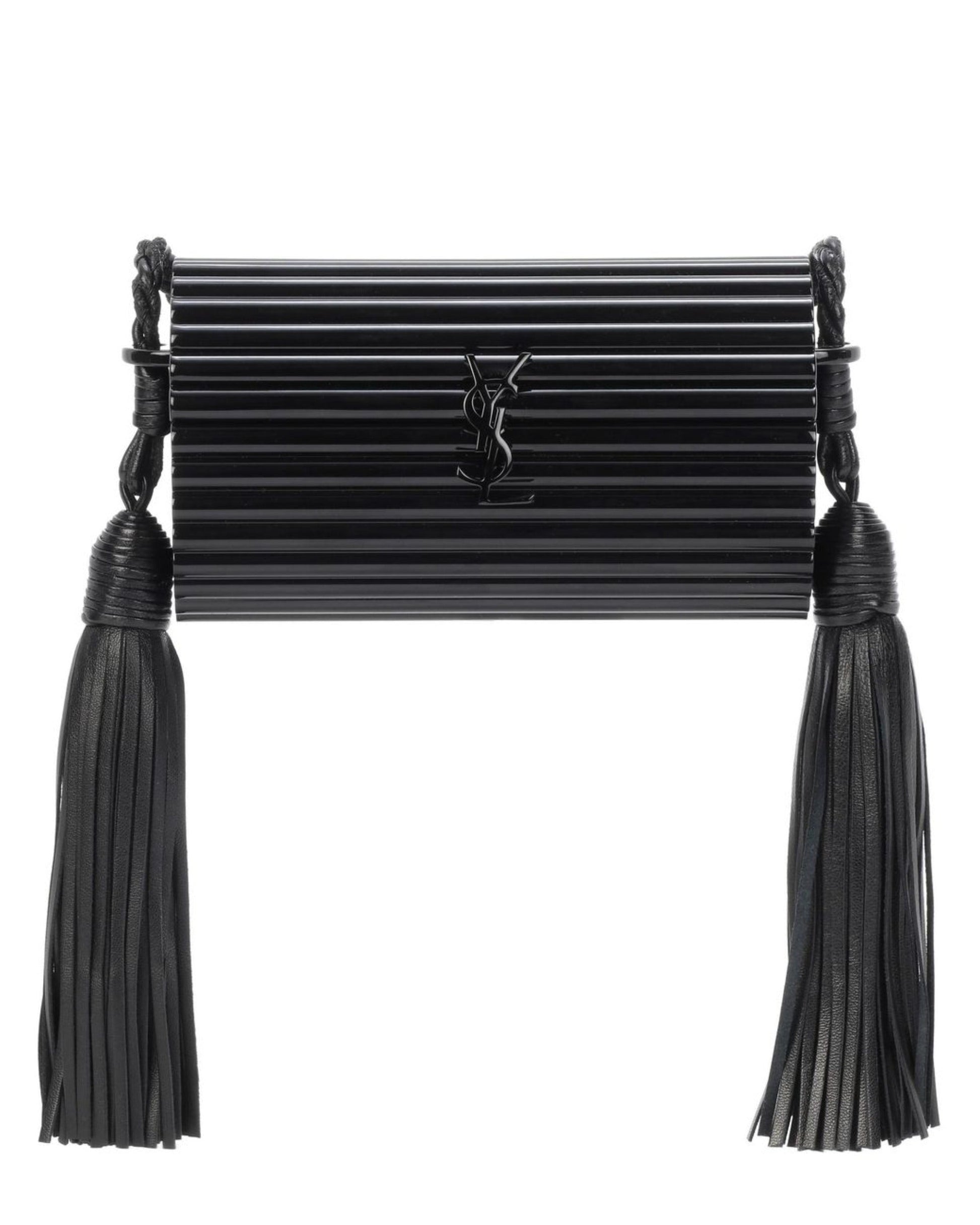 Saint Laurent Black Plexiglass Minaudière Opium Box Bag. Saint Laurent Plexiglass Minaudière Opium Box Bag - Black This bag is made of black ribbed plexiglass with black lambskin leather fringes on each side. Featuring a prominent black YSL monogram logo on the front. The flap opens to a black leather interior. Model 5173900