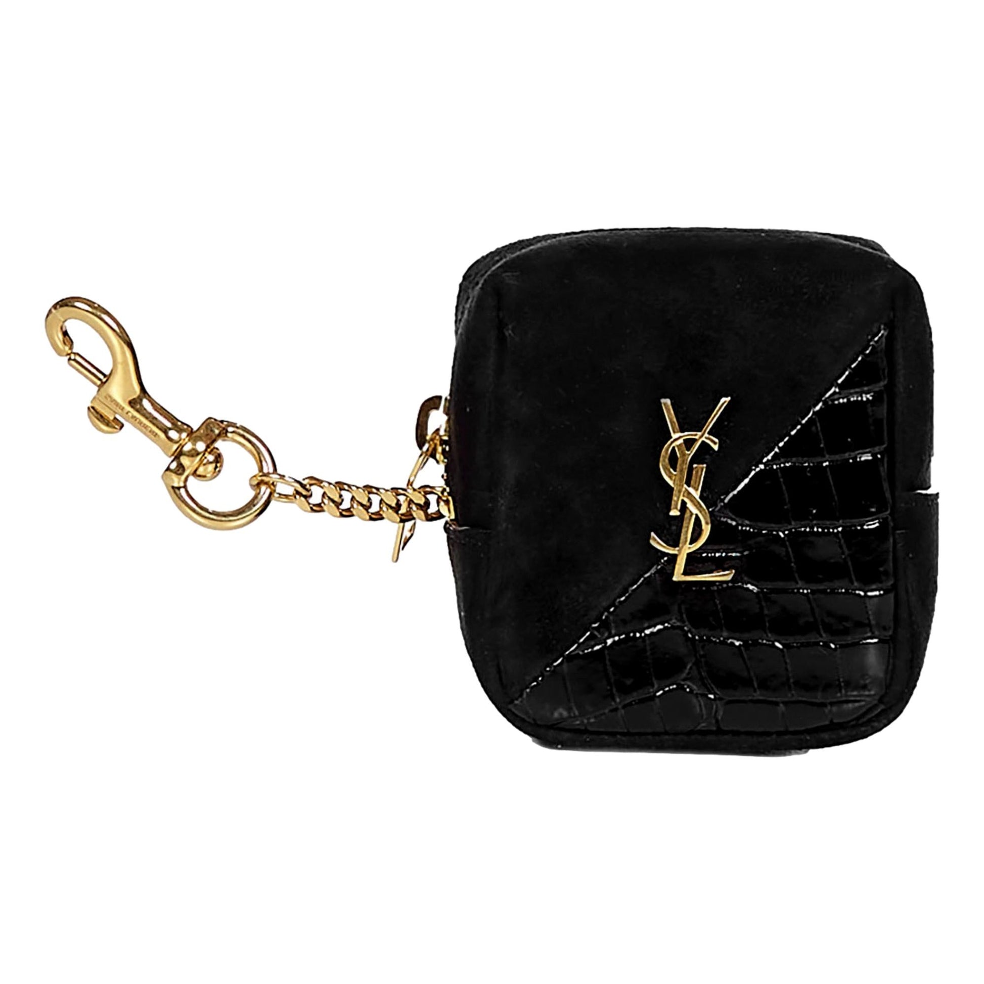 The Saint Laurent Jamie Cube Charm is a stylish addition to your keyring. The design of this charm are enhanced by the croc embossed patent leather. Perfect for ladies on the go who like to keep the bare essentials at hand. This is an elegant way to carry your id and credit cards. Features gold-tone hardware, YSL logo emblem detail, zip closure and snap hook.