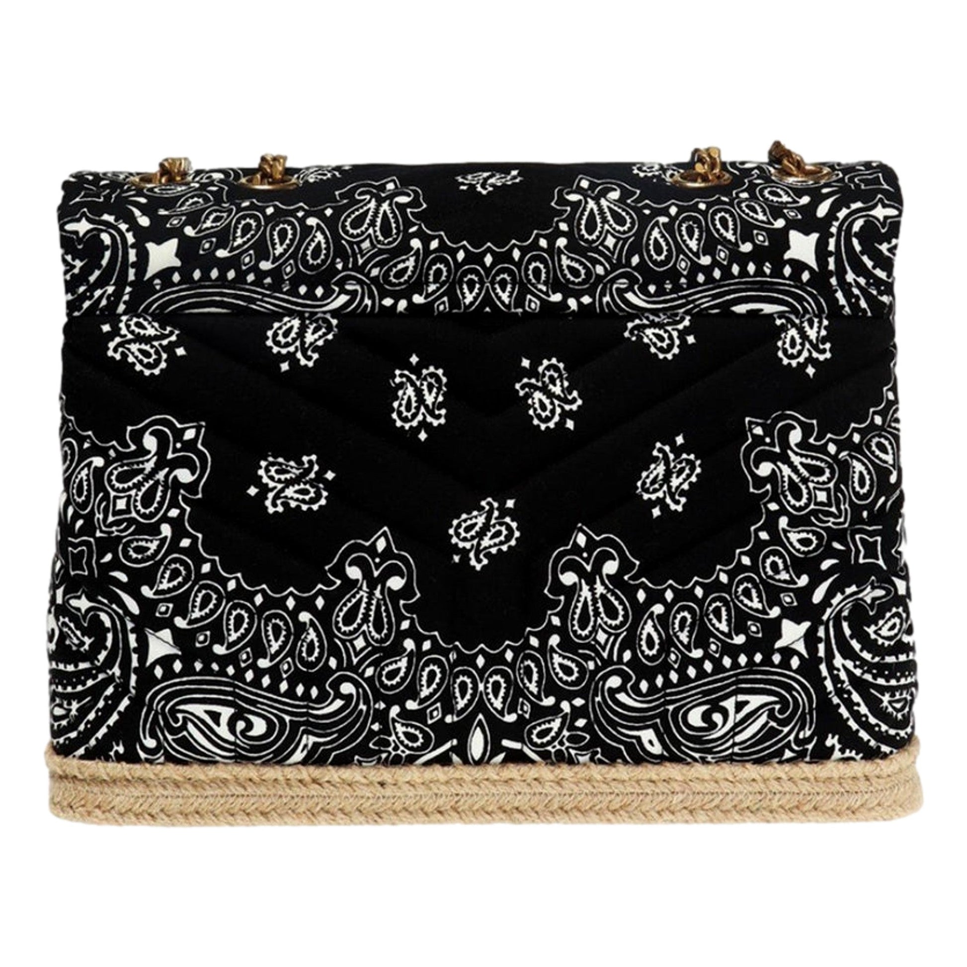 This black 'Loulou' quilted shoulder bag from Saint Laurent is crafted with a paisley printed cotton. The front flap is fastened with magnetic snap closure and enriched by gold-tone YSL monogram. The bags opens to a spacious interior with three compartments and a black lining. The bottom of the bag is constructed with an espadrille-like woven insert. This is a one of a kind bag for a one of a kind look!