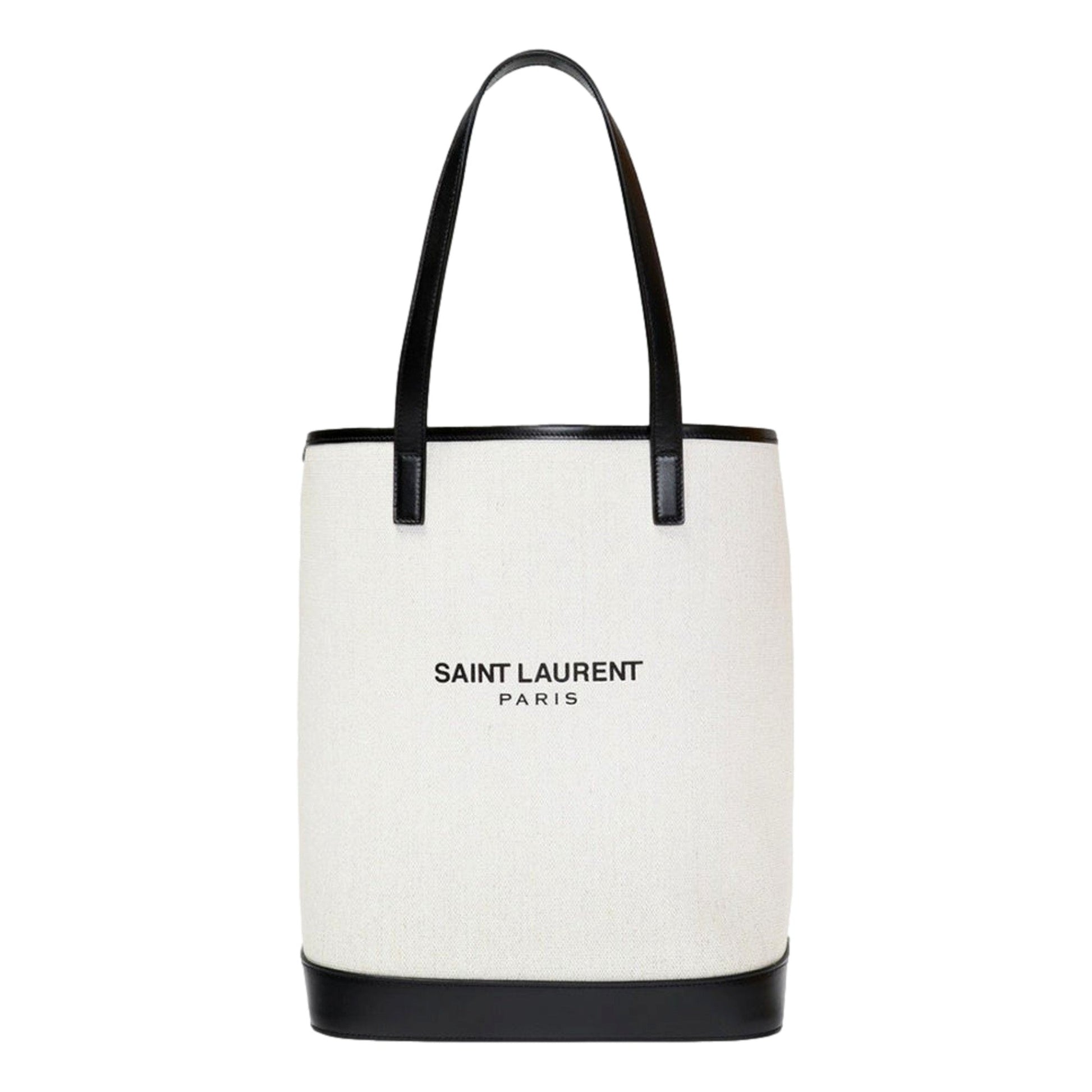 This "Teddy" bucket bag is is crafted of an off-white coated linen with a black printed Saint Laurent logo. The open top bucket bag includes a detachable black leather drawstring insert with a suede pouch. This is a perfect tote for on the go and everyday use. It is coated canvas, so perfect for the pool or beach, with the distinctive style from Saint Laurent!