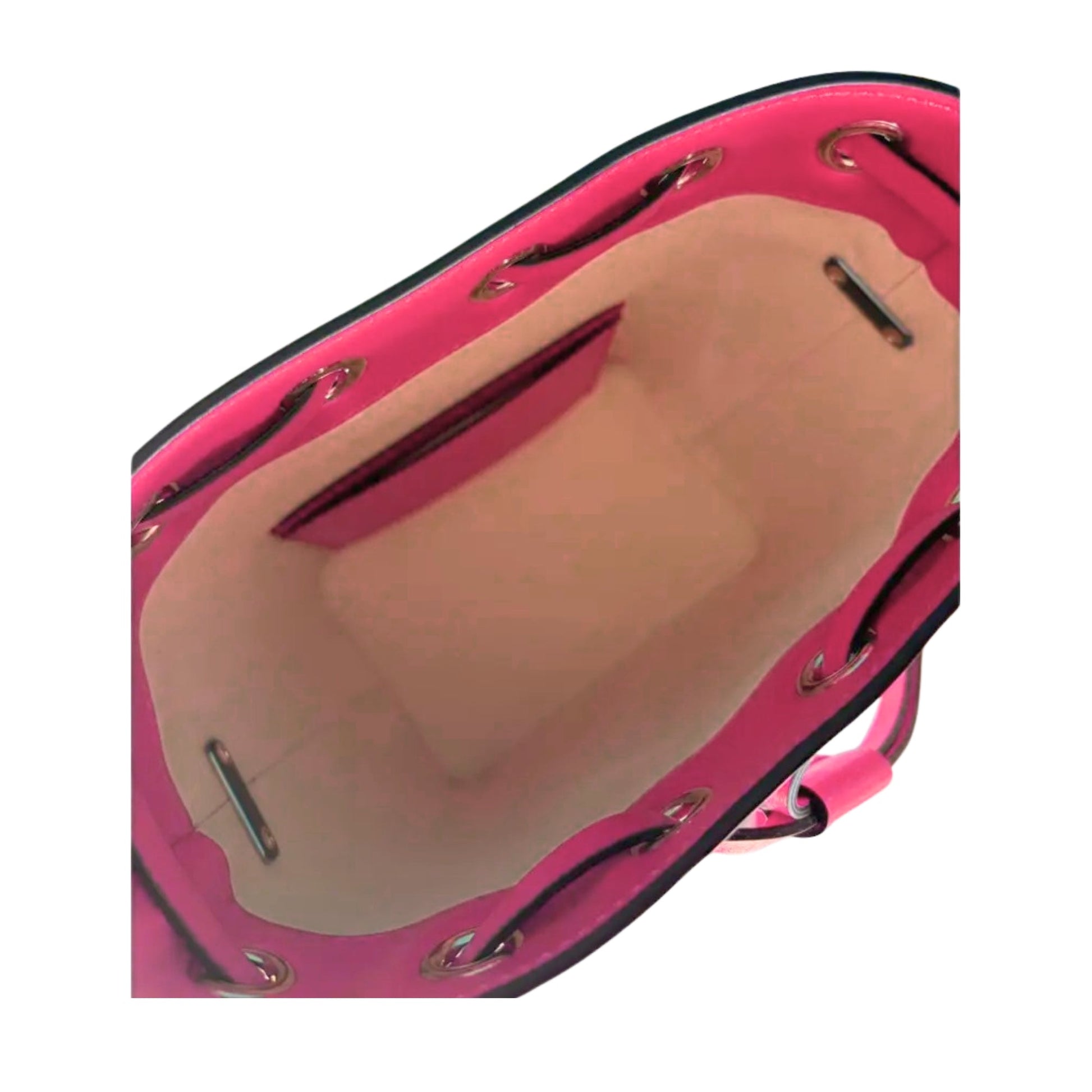 Introducing the Valentino Garavani VLogo Walk crossbody bucket bag, crafted with vibrant hot pink calf leather. The saturated pink hue exudes femininity, while the iconic stitched VLogo adds a touch of opulence. Perfect for the modern woman on the go, its small compact size and structured design features an interior card slot pocket. Elevate any ensemble with this statement piece that that can be carried with the detachable top handle or as a crossbody with the adjustable leather strap. Experience the fusion of fashion and functionality with the Valentino Garavani VLogo Walk Bucket Crossbody Bag.